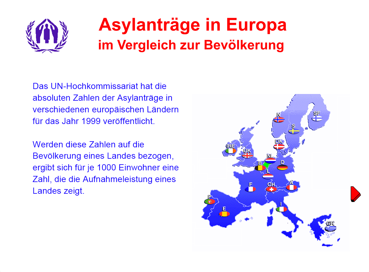 Das UN-Hochkommissariat hat die absoluten Zahlen der Asylanträge in verschiedenen europäischen Ländern für das Jahr 1999 veröffentlicht.