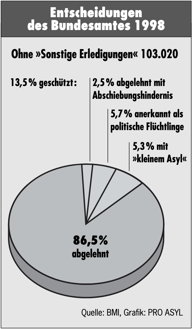 PRO ASYL hat mit realistischen Forderungen versucht, Einfluß auf den Verlauf der Koalitionsverhandlungen und die ersten Schritte der Regierung zu nehmen. Eine Rückkehr zum Asylgrundrecht alter Fassung nach Art. 16 Abs. 2 Satz 2 GG war von vornherein unrealistisch. Die Rückkehr zu den Standards des internationalen Völkerrechts, die Anerkennung der Spruchpraxis des Europäischen Gerichtshofs für Menschenrechte in Sachen Abschiebungsschutz bei drohender Folter sowie ein menschlicherer Umgang mit Flüchtlingen – dies waren und sind auch weiterhin realistische Erwartungen an die neue Bundesregierung. Die erste Ernüchterung folgte beim Bekanntwerden der Koalitionsvereinbarung im Oktober 1998. Eine kritische Lektüre machte klar: