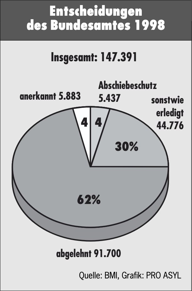 Was hat die neue rot-grüne Bundesregierung in den Bereichen bewegt, in denen sie zuständig und handlungsfähig ist? PRO ASYL hat ab November 1998 in einer Vielzahl von Briefen an den Bundesarbeitsminister, an das Bundesministerium des Innern und an das Auswärtige Amt konkrete Handlungsvorschläge gemacht. Hier die kritische Zwischenbilanz: