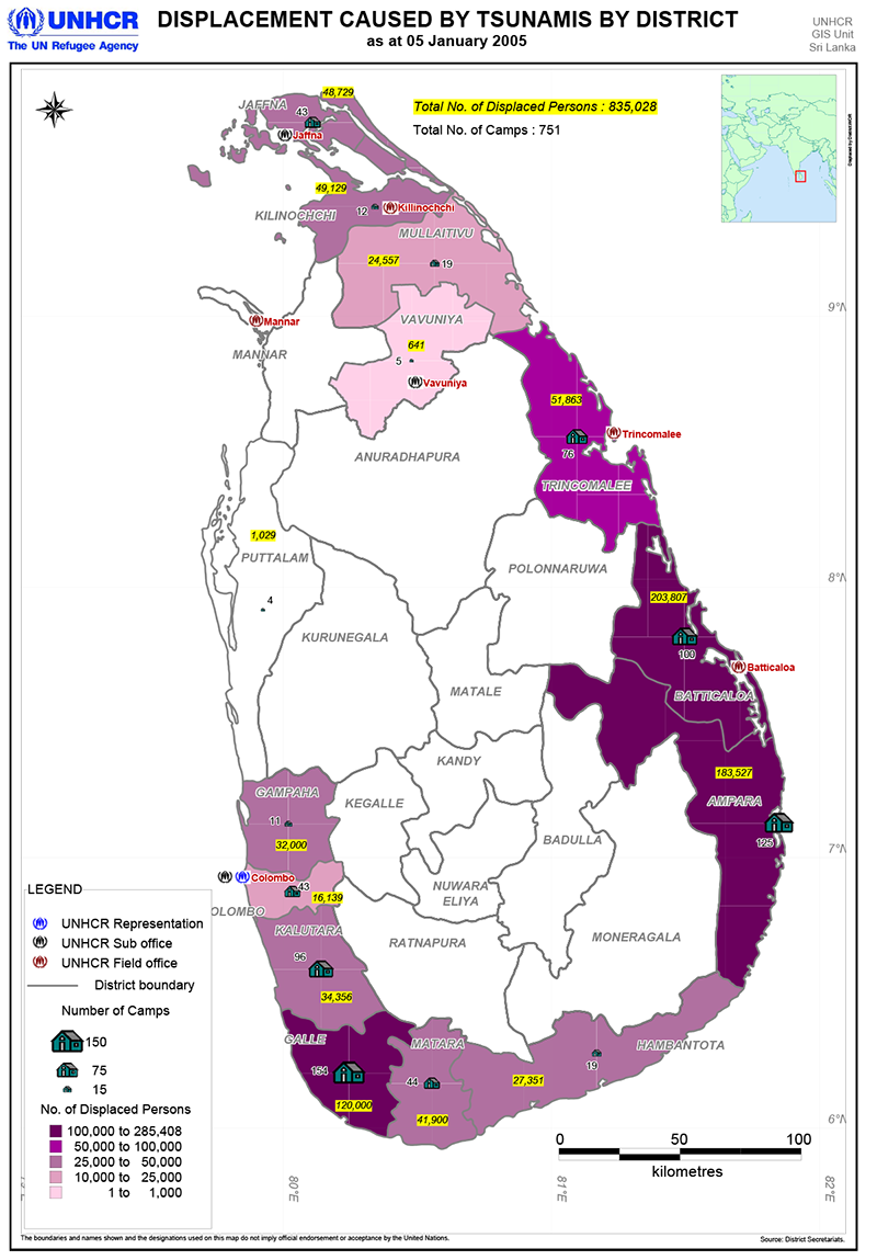Der Tsunami hat nach Angaben von UNHCR mehr als 835.000 Menschen in Sri Lankas Küstenprovinzen entwurzelt, die in mehr als 750 Lagern untergebracht sind. Etwa die Hälfte der displaced persons lebt in den Tamilengebieten. Die UNHCR-Statistik erfasst nur die durch die Flutkatastrophe obdachlos gewordenen Menschen, nicht diejenigen, die in den vergangenen Jahren in Folge des Bürgerkriegs zu Binnenflüchtlingen wurden.