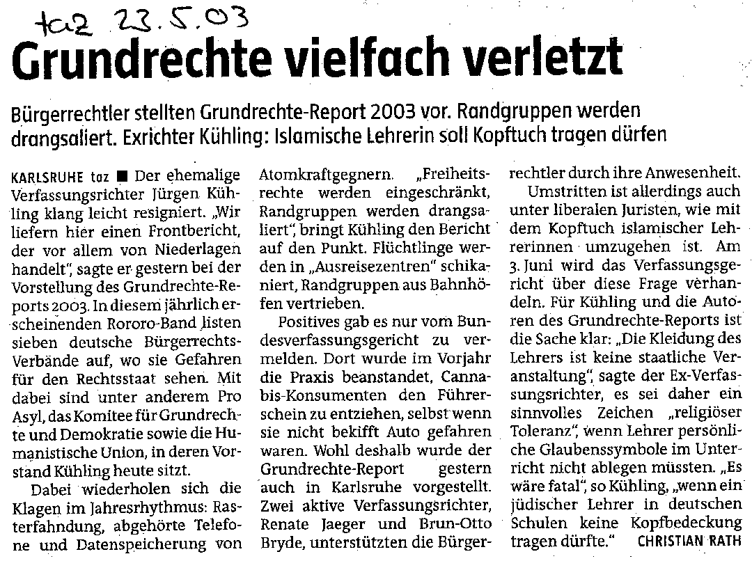 Umstritten ist allerdings auch unter liberalen Juristen, wie mit dem Kopftuch islamischer Lehrerinnen umzugehen ist. Am 3. Juni wird das Verfassungsgericht über diese Frage verhandeln. Für Kühling und die Autoren des Grundrechte-Reports ist die Sache klar: „Die Kleidung des Lehrers ist keine staatliche Veranstaltung“, sagte der Ex-Verfassungsrichter, es sei daher ein sinnvolles Zeichen „religiöser Toleranz“, wenn Lehrer persönliche Glaubenssymbole im Unterricht nicht ablegen müssten. „Es wäre fatal“; so Kühling, „wenn ein jüdischer Lehrer in deutschen Schulen keine Kopfbedeckung tragen dürfte.“ – CHRISTIAN RATH