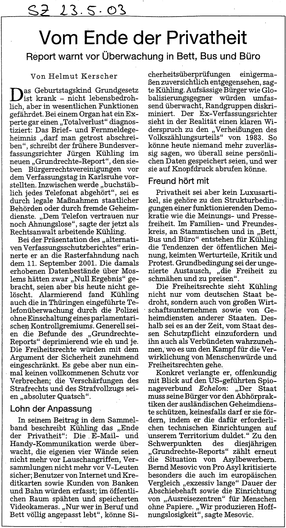 In seinem Beitrag in dem Sammelband beschreibt Kühling das Ende der „Privatheit“: Die „E-Mail- und Handy-Kommunikation werde überwacht, die eigenen vier Wände seien nicht mehr vor Lauschangriffen, Versammlungen nicht mehr vor V-Leuten sicher; Benutzer von Internet und Kreditkarten sowie Kunden von Banken und Bahn würden erfasst; im öffentlichen Raum spähten und speicherten Videokameras. „Nur wer in Beruf und Bett völlig angepasst lebt“, könne Sicherheitsüberprüfungen einigermaßen zuversichtlich entgegensehen, sagte Kühling. Aufsässige Bürger wie Globalisierungsgegner würden umfassend überwacht, Randgruppen diskriminiert. Der Ex-Verfassungsrichter sieht in der Realität einen klaren Widerspruch zu den „Verheißungen des Volkszählungsurteils“ von 1983. So könne heute niemand mehr zuverlässig sagen, wo überall seine persönlichen Daten gespeichert seien, und wer sie auf Knopfdruck abrufen könne.