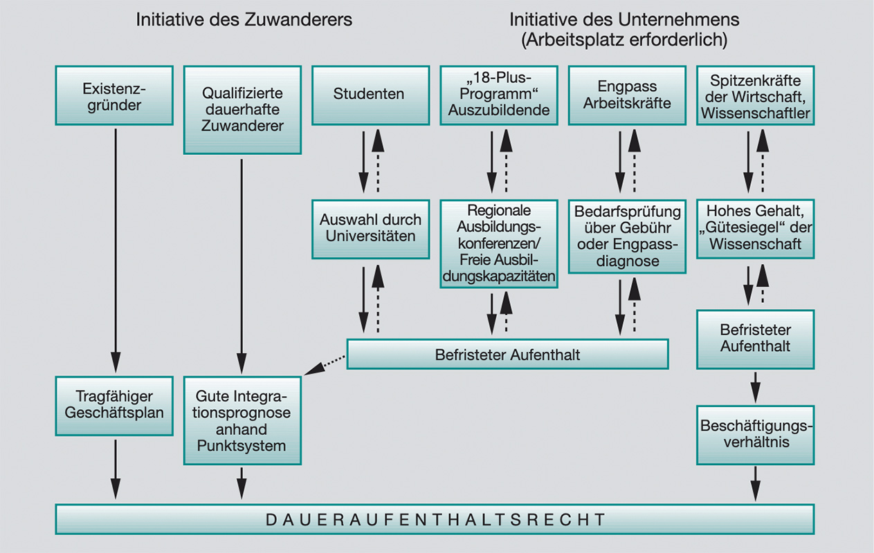Arbeitsmigranten mit einem befristeten Aufenthaltsstatus können sich über das Punktesystem für einen Daueraufenthalt qualifizieren, wenn sie sich erfolgreich in den Arbeitsmarkt und in die Gesellschaft integriert haben. Spitzenkräften der Wirtschaft und Wissenschaftlern sollte bei Fortbestand des Arbeitsverhältnisses der Übergang zum unbefristeten Aufenthalt jedoch außerhalb des Punktesystems ermöglicht werden. Bürgerkriegsflüchtlinge haben ebenfalls Zugang zum Punktesystem; abgelehnte Asylbewerber nur dann, wenn sie freiwillig ausgereist sind und ihren Antrag vom Ausland aus stellen.